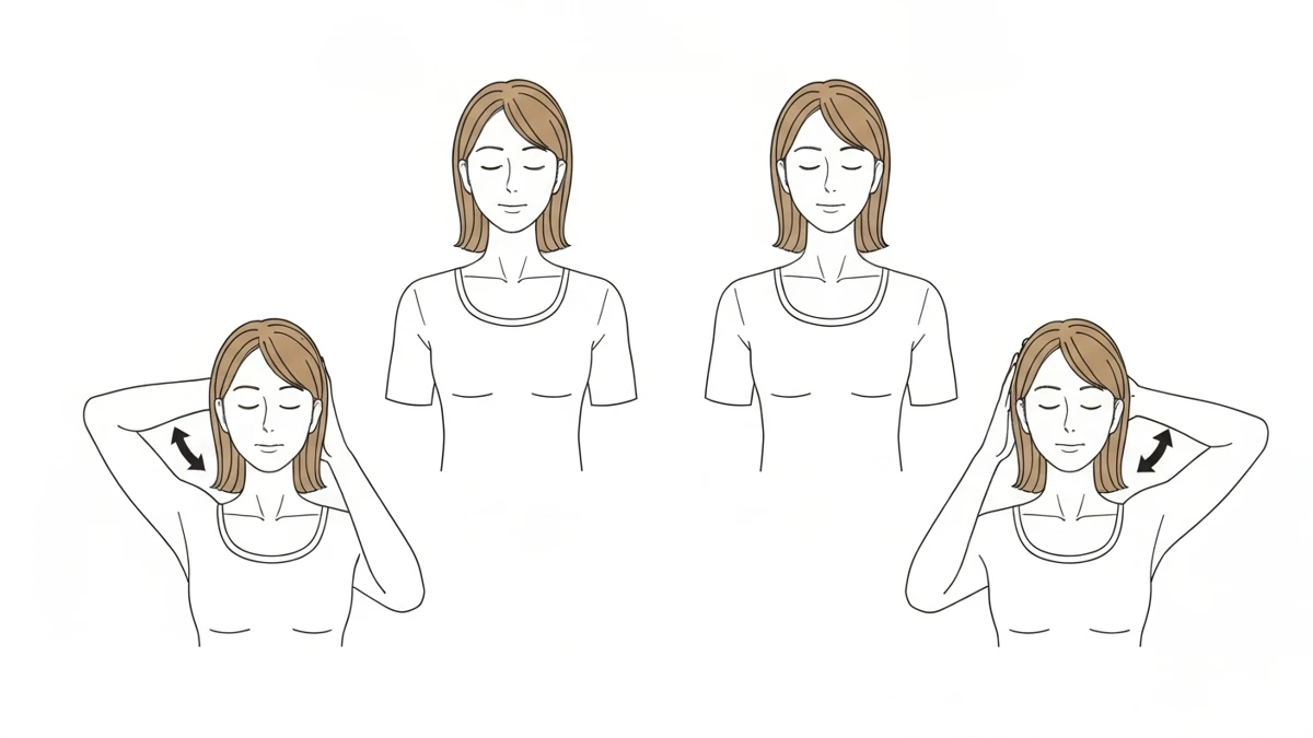 - ゆっくりと首を左右に倒し、各方向で15秒キープします。